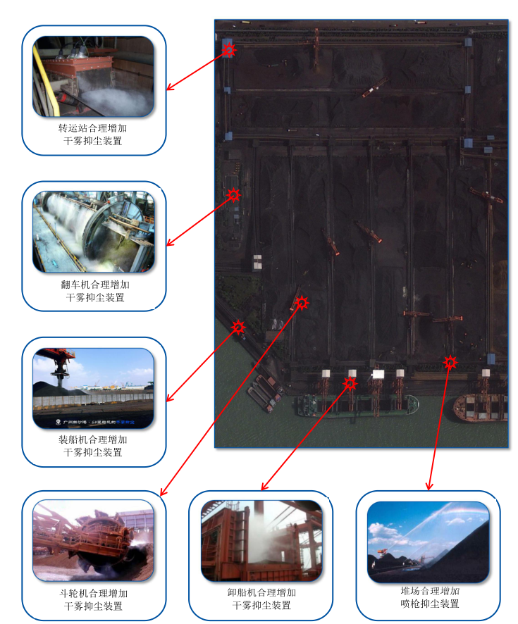 工业源头的治理:采用系统化解决方案,将气象监测站、防风抑尘网、干雾抑尘、雾炮抑尘、喷枪抑尘、及汽车洗轮机等装置有效的结合,最终实现对无组织粉尘的源头治理。